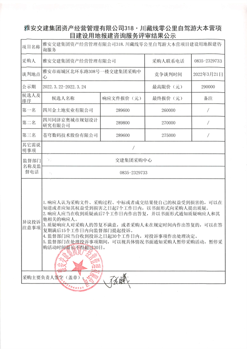 威廉希尔集团资产经营管理有限公司318川藏线零公里自驾游大本营项目建设用地报建咨询服务评审结果公示