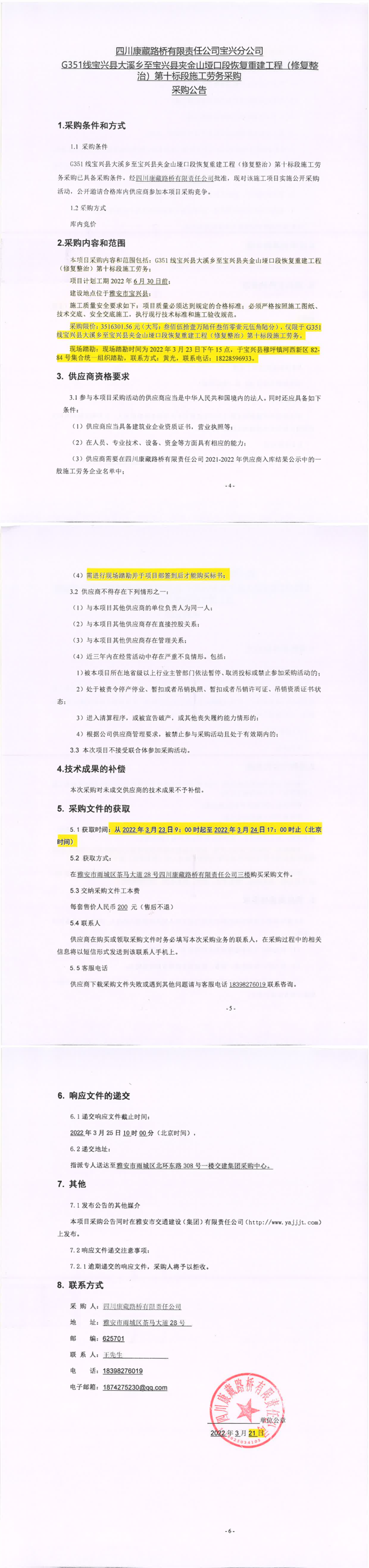 四川康藏路桥有限责任公司宝兴分公司G351线宝兴县大溪乡至宝兴县夹金山垭口段恢复重建工程(修复整治)第十标段施工劳务采购采购公告