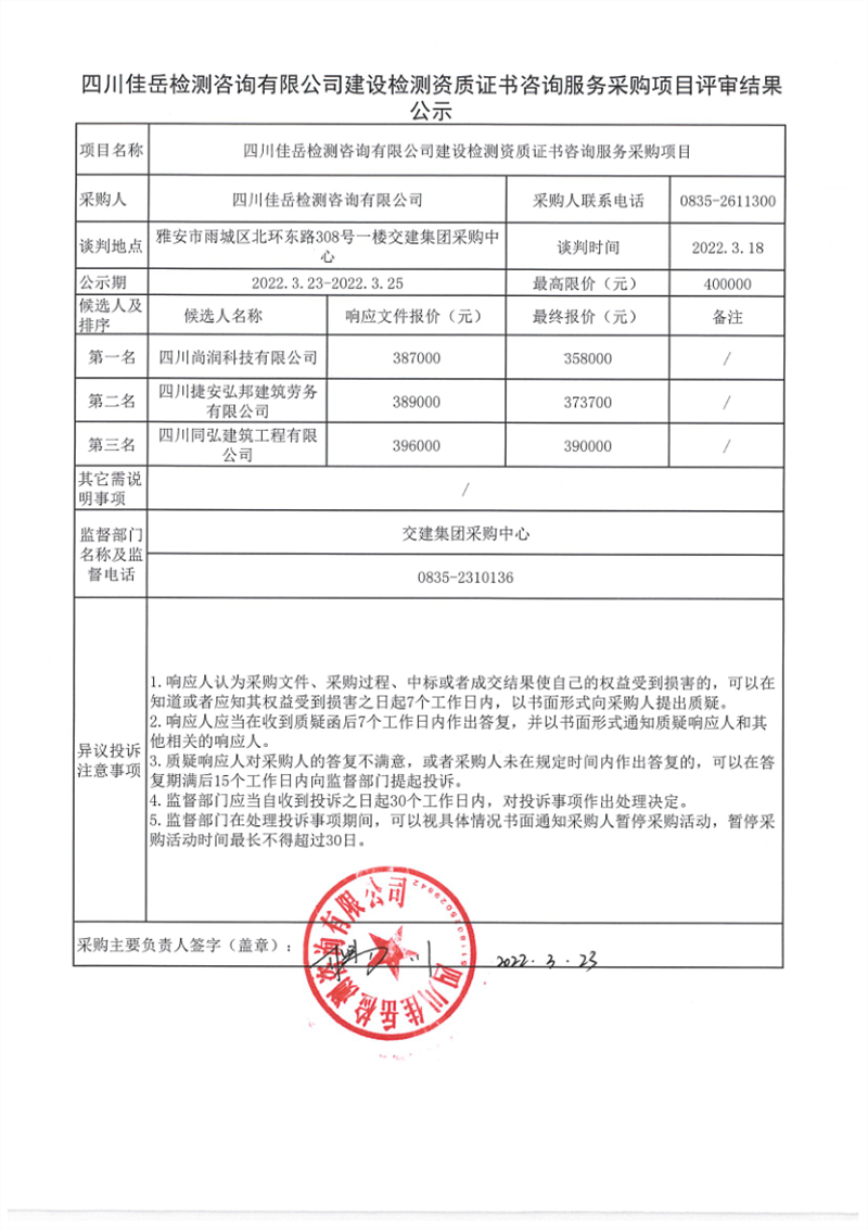 四川佳岳检测咨询有限公司建设检测资质证书咨询服务采购项目评审结果公示
