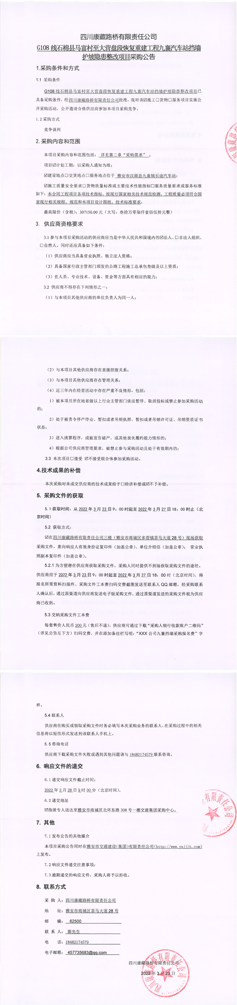 四川康藏路桥有限责任公司G108线石棉县马福村至大营盘段恢复重建工程九襄汽车站挡墙护坡隐患整改项目采购公告