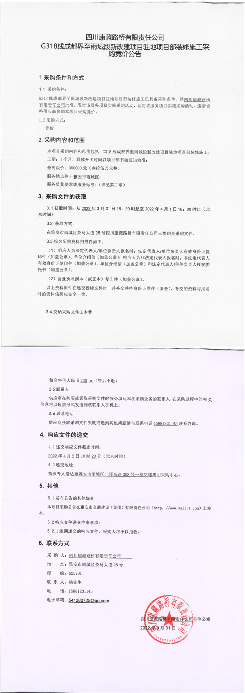四川康藏路桥有限责任公司G318线成都界至雨城段新改建项目驻地项目部装修施工采购竞价公告