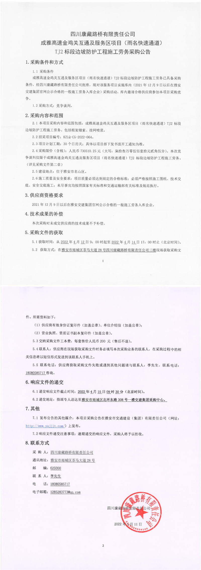 四川康藏路桥有限责任公司成雅高速金鸡关互通及服务区项目(雨名快速通道)TJ2标段边坡防护工程施工劳务采购公告