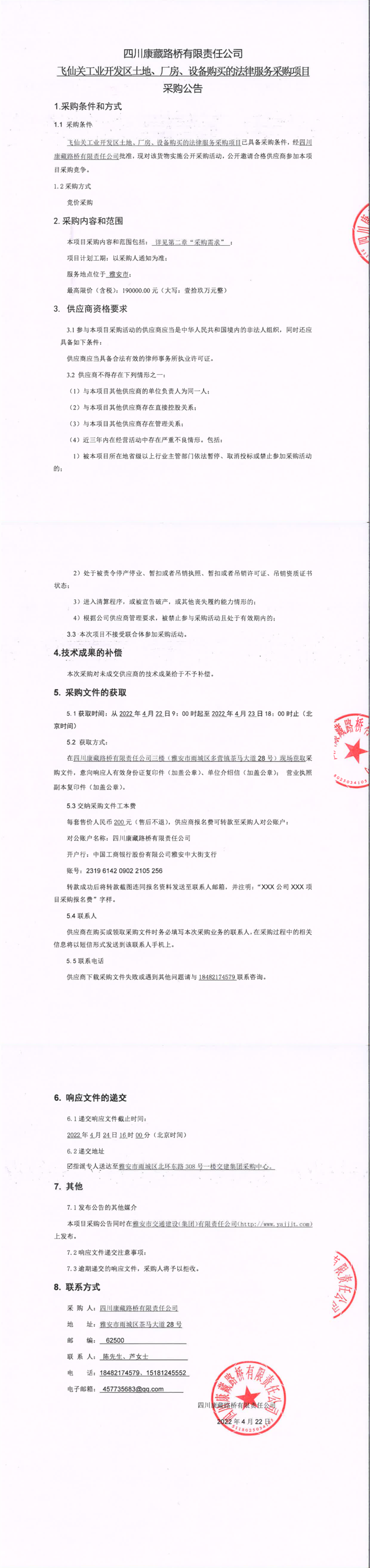 四川康藏路桥有限责任公司飞仙关工业开发区土地、厂房、设备购买的法律服务采购项目采购公告