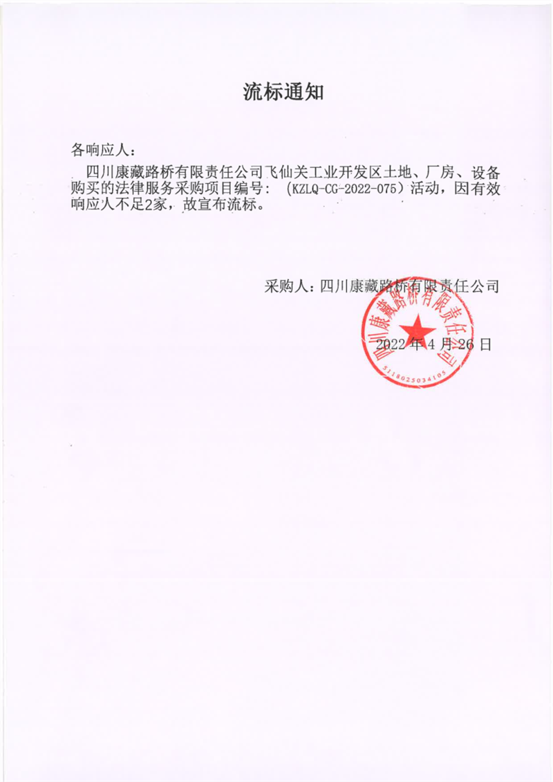 四川康藏路桥有限责任公司飞仙关工业开发区土地、厂房、设备购买的法律服务采购项目流标通知