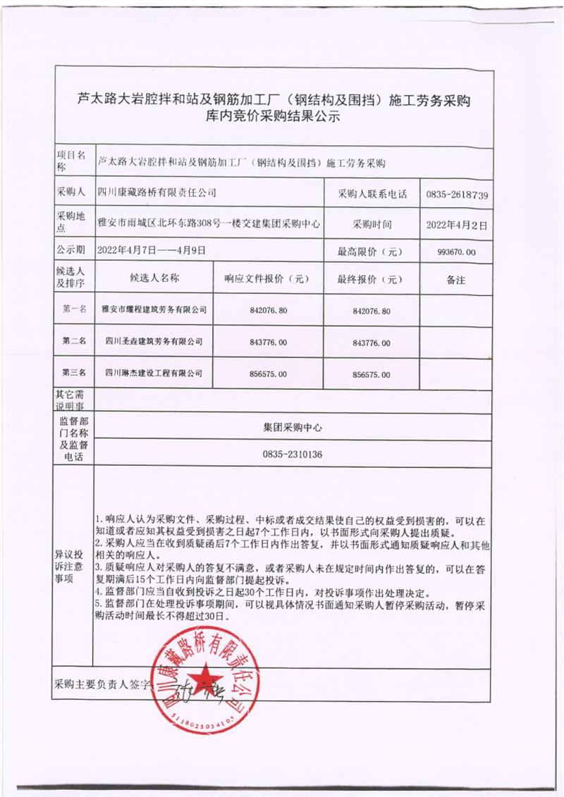 四川康藏路桥有限责任公司芦太路大岩腔拌和站及钢筋加工厂(钢结构及围档)施工劳务采购库内竞价采购结果公示