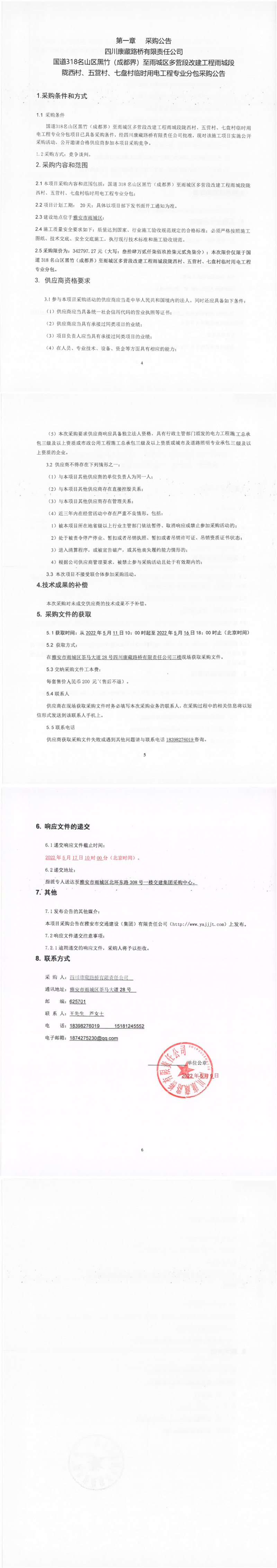 四川康藏路桥有限责任公司国道318名山区黑竹(成都界)至雨城区多营段改建工程雨城段陇西材、五营村、七盘村临时用电工程专业分包采购公告
