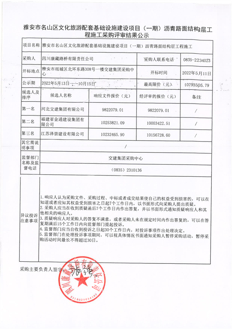 四川康藏路桥有限责任公司雅安市名山区文化旅游配套基础设施建设项目(一期)沥青路面结构层工程施工采购评审结果公示
