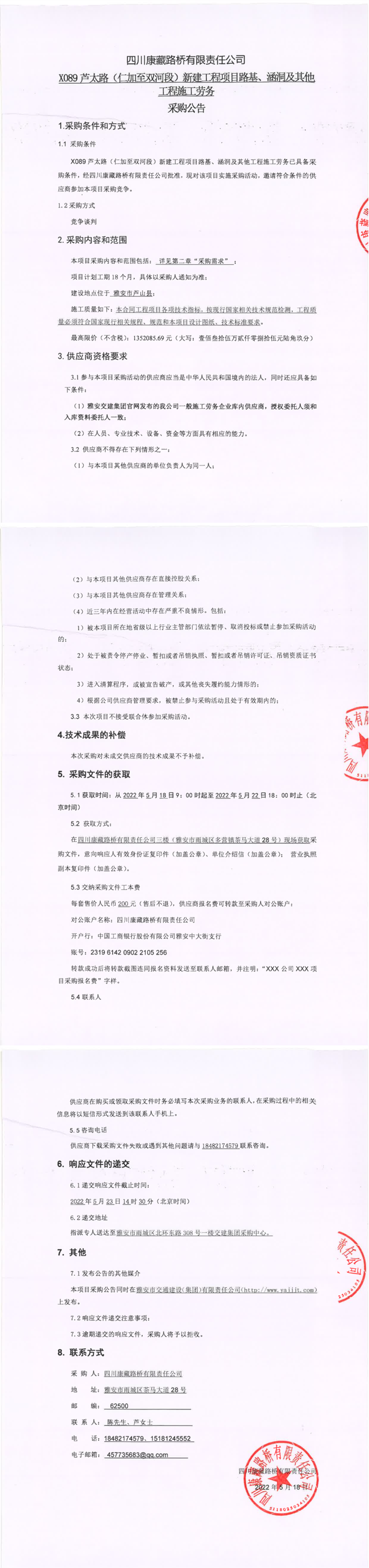 四川康藏路桥有限责任公司X089芦太路(仁加至双河段)新建工程项目路基、涵洞及其他工程施工劳务采购公告
