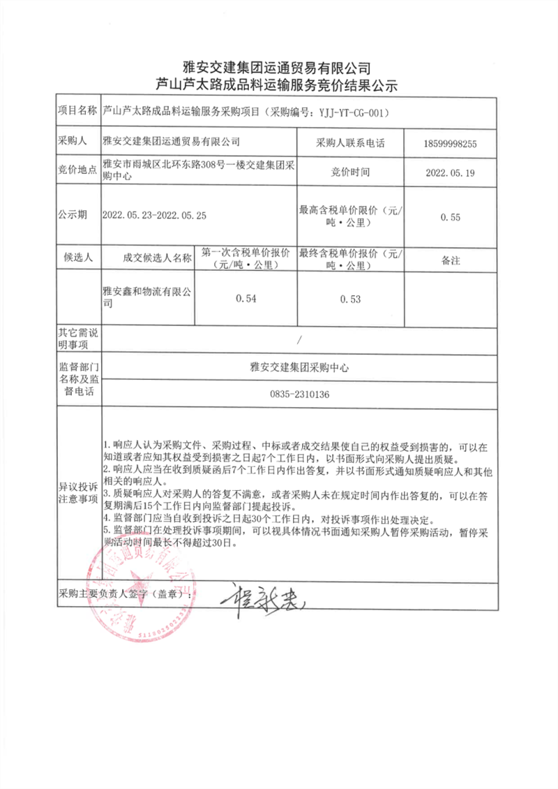 威廉希尔集团运通贸易有限公司芦山芦太路成品料运输服务竞价结果公示