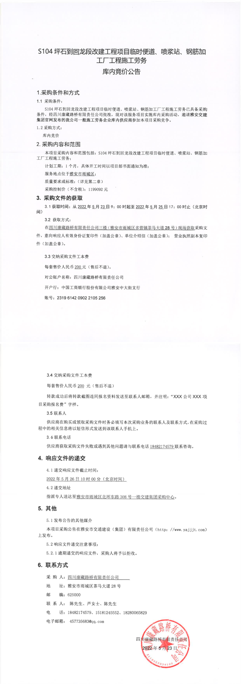 四川康藏路桥有限责任公司S104坪石到回龙段改建工程项目临时便道、喷浆站、钢筋加工厂工程施工劳务库内竞价公告