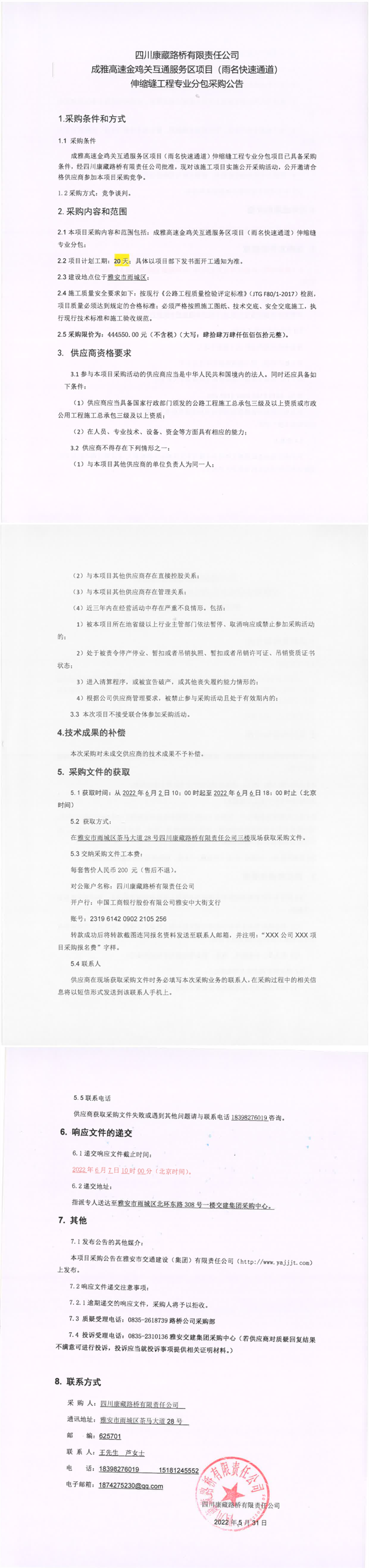 四川康藏路桥有限责任公司成雅高速金鸡关互通服务区项目(雨名快速通道)伸缩缝工程专业分包采购公告