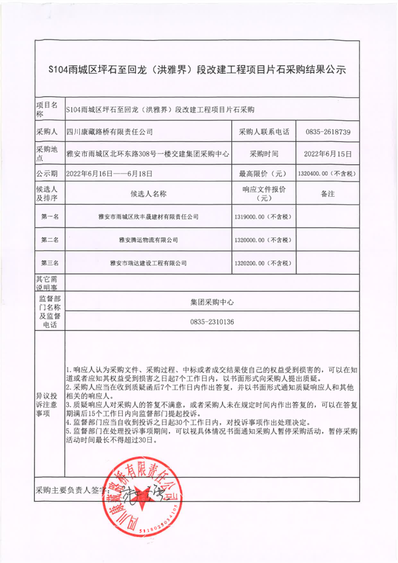 四川康藏路桥有限责任公司S104雨城区坪石至回龙(洪雅界)段改建工程项目片石采购结果公示