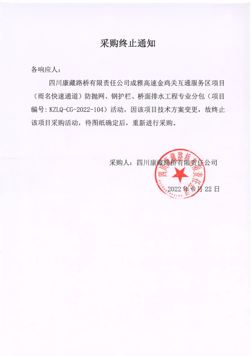 四川康藏路桥有限责任公司成雅高速金鸡关互通服务区项目(雨名快速通道)防抛网、钢护栏、桥面排水工程专业分包采购终止通知