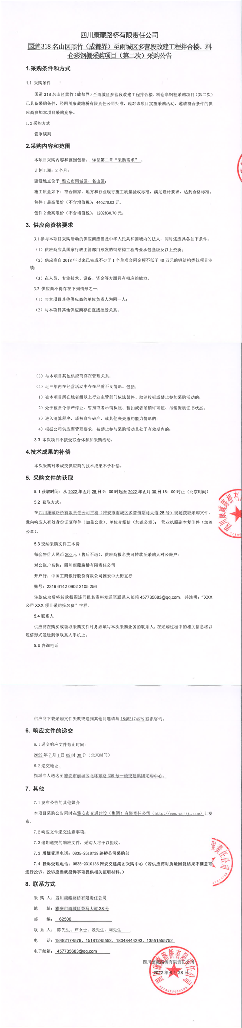 四川康藏路桥有限责任公司国道318名山区黑竹(成都界)至雨城区多营段改建工程拌合楼、料仓彩钢棚采购项目(第二次)采购公告