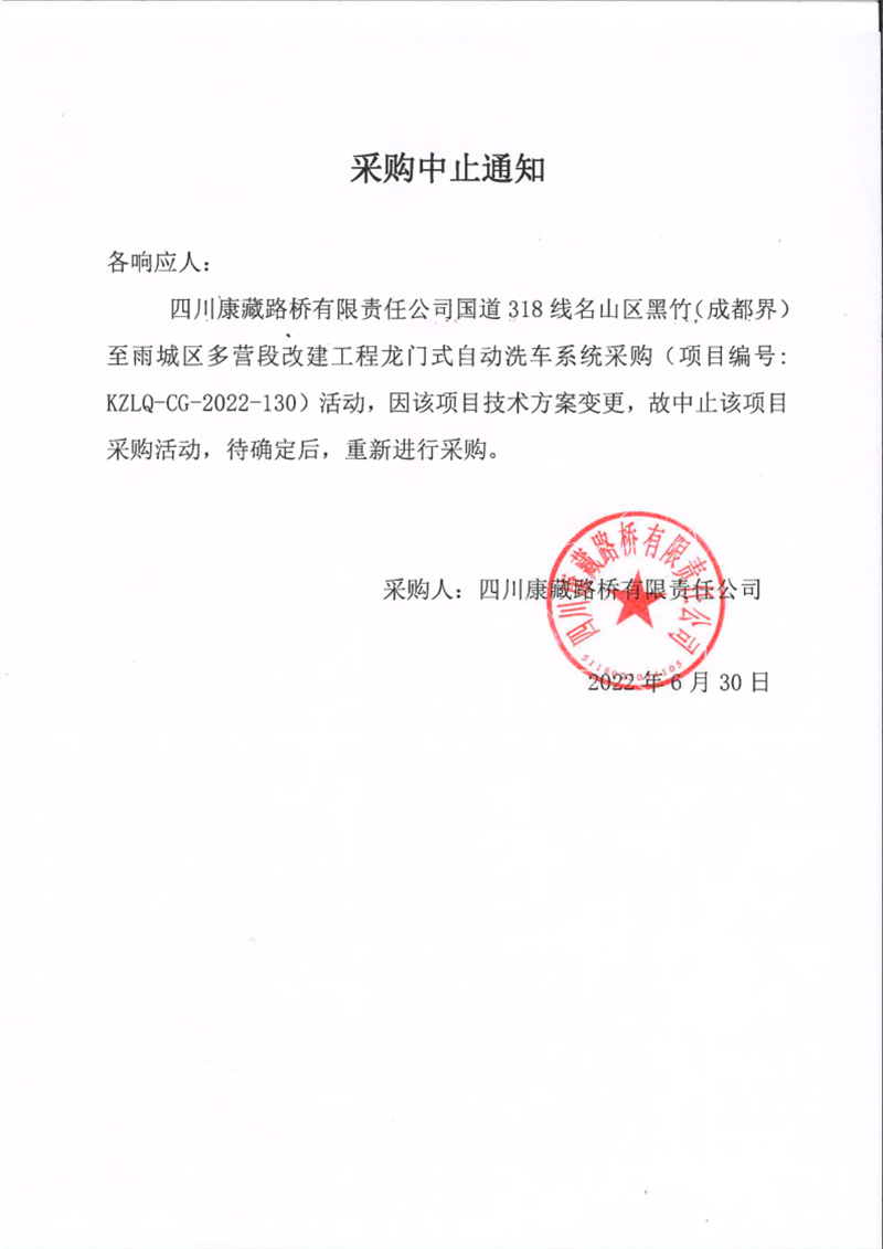 四川康藏路桥有限责任公司国道318线名山区黑竹(成都界)至雨城区多营段改建工程龙门式自动洗车系统采购中止通知