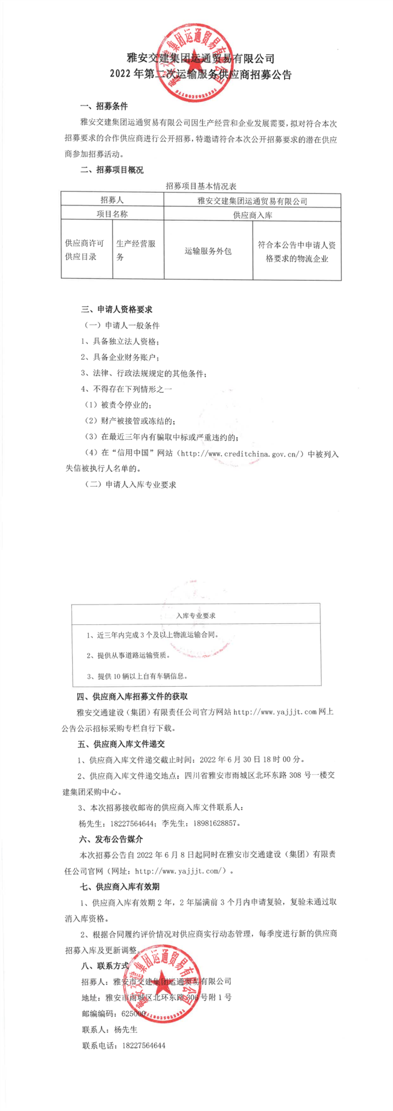 威廉希尔集团运通贸易有限公司2022年第二次运输服务供应商招募公告