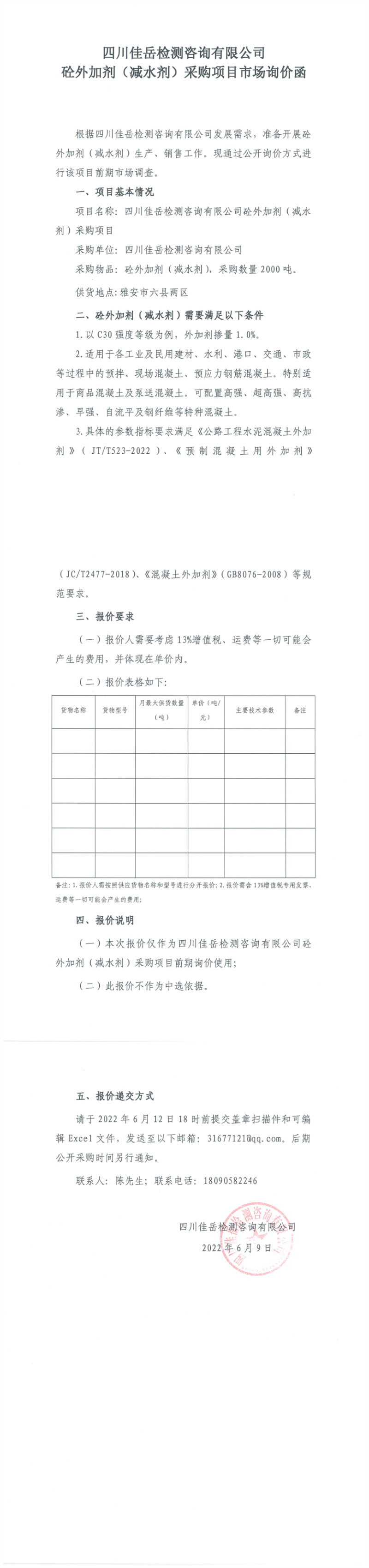 四川佳岳检测咨询有限公司砼外加剂(减水剂)采购项目市场询价函
