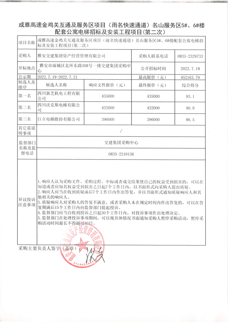 威廉希尔集团资产经营管理有限公司成雅高速金鸡关互通及服务区项目(雨名快速通道)名山服务区5#、6#楼配套公寓电梯招标及安装工程项目招标公告(第二次)结果公示