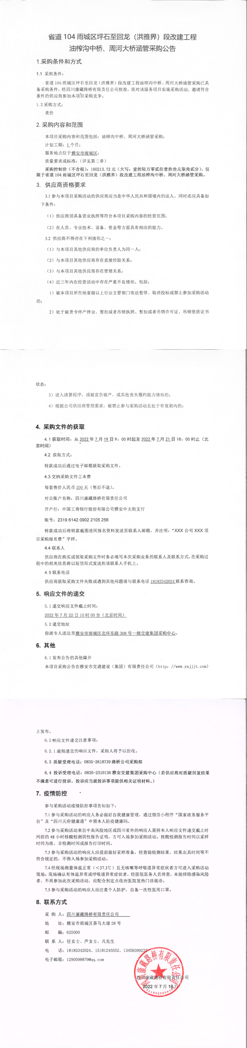 四川康藏路桥有限责任公司省道104雨城区坪石至回龙(洪雅界)段改建工程油榨沟中桥、周河大桥涵管采购公告
