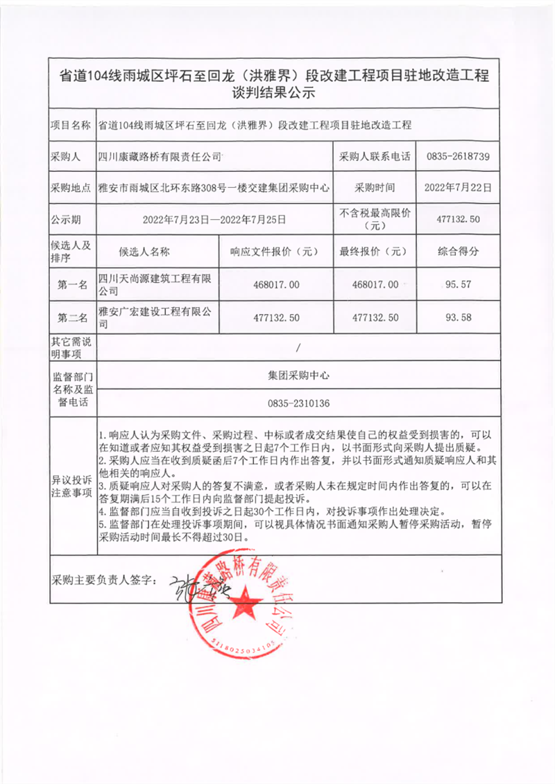 四川康藏路桥有限责任公司省道104线雨城区坪石至回龙(洪雅界)段改建工程项目驻地改造工程谈判结果公示