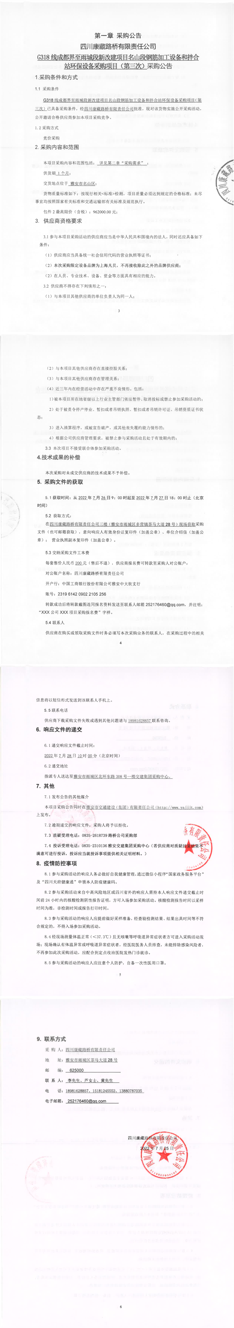 四川康藏路桥有限责任公司G318线成都界至雨城段新改建项目名山段钢筋加工设备和拌合站环保设备采购项目(第三次)采购公告