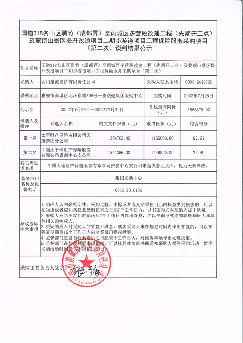 四川康藏路桥有限责任公司国道318名山区黑竹(成都界)至雨城区多营段改建工程(先期开工点)及蒙顶山景区提升改造项目二期步游道项目工程保险服务采购项目(第二次)谈判结果公示