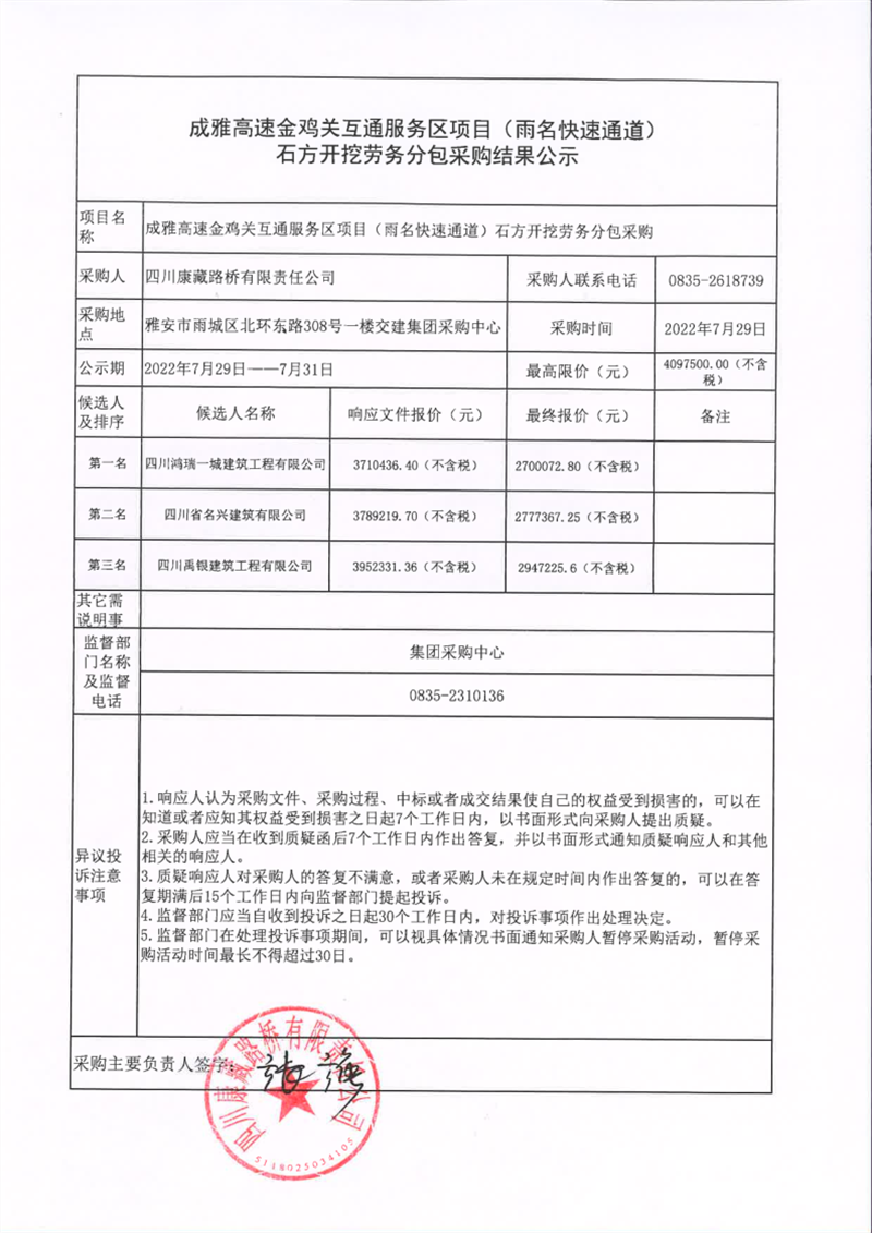 四川康藏路桥有限责任公司成雅高速金鸡关互通服务区项目(雨名快速通道)石方开挖劳务分包采购结果公示