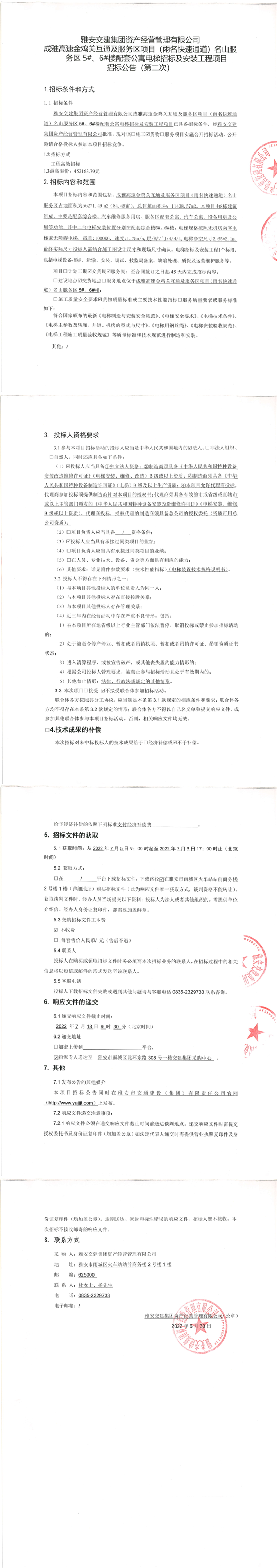威廉希尔集团资产经营管理有限公司成雅高速金鸡关互通及服务区项目(雨名快速通道)名山服务区5#、6#楼配套公寓电梯招标及安装工程项目招标公告(第二次)
