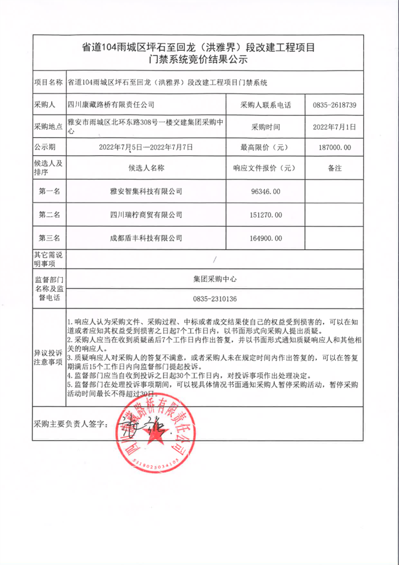 四川康藏路桥有限责任公司省道104雨城区坪石至回龙(洪雅界)段改建工程门禁系统竞价结果公示