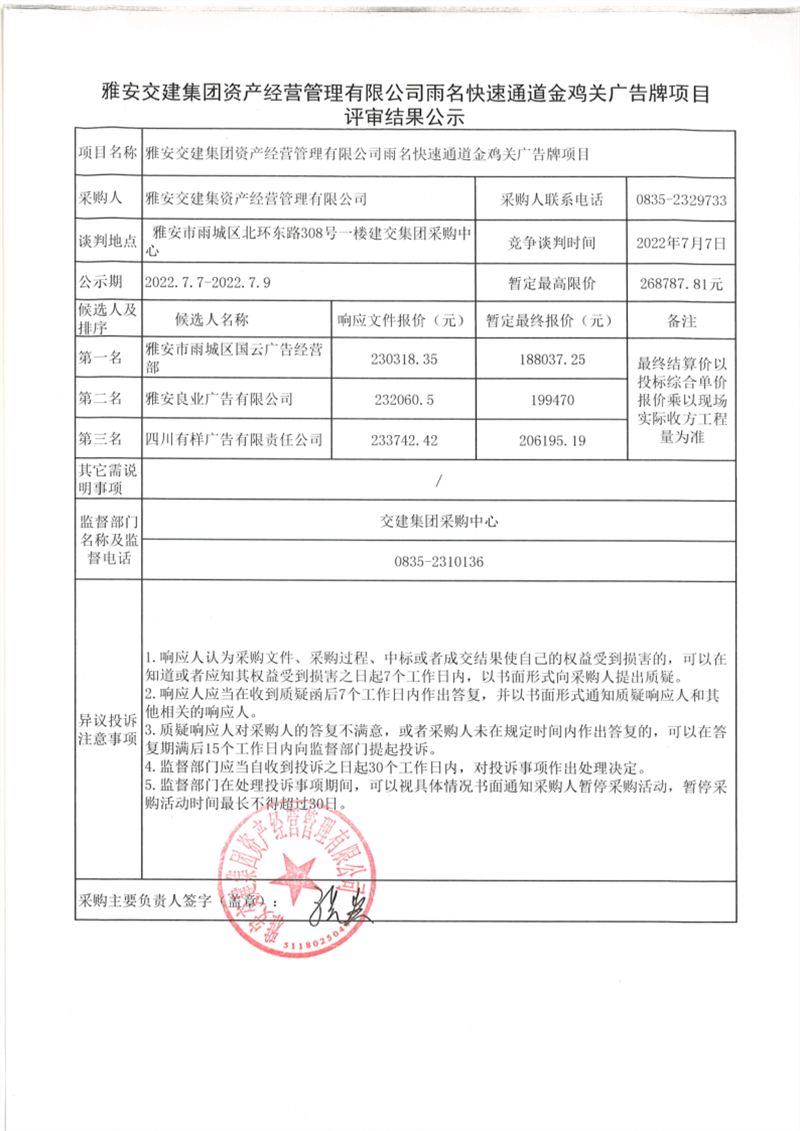 威廉希尔集团资产经营管理有限公司雨名快速通道金鸡关广告牌项目评审结果公示