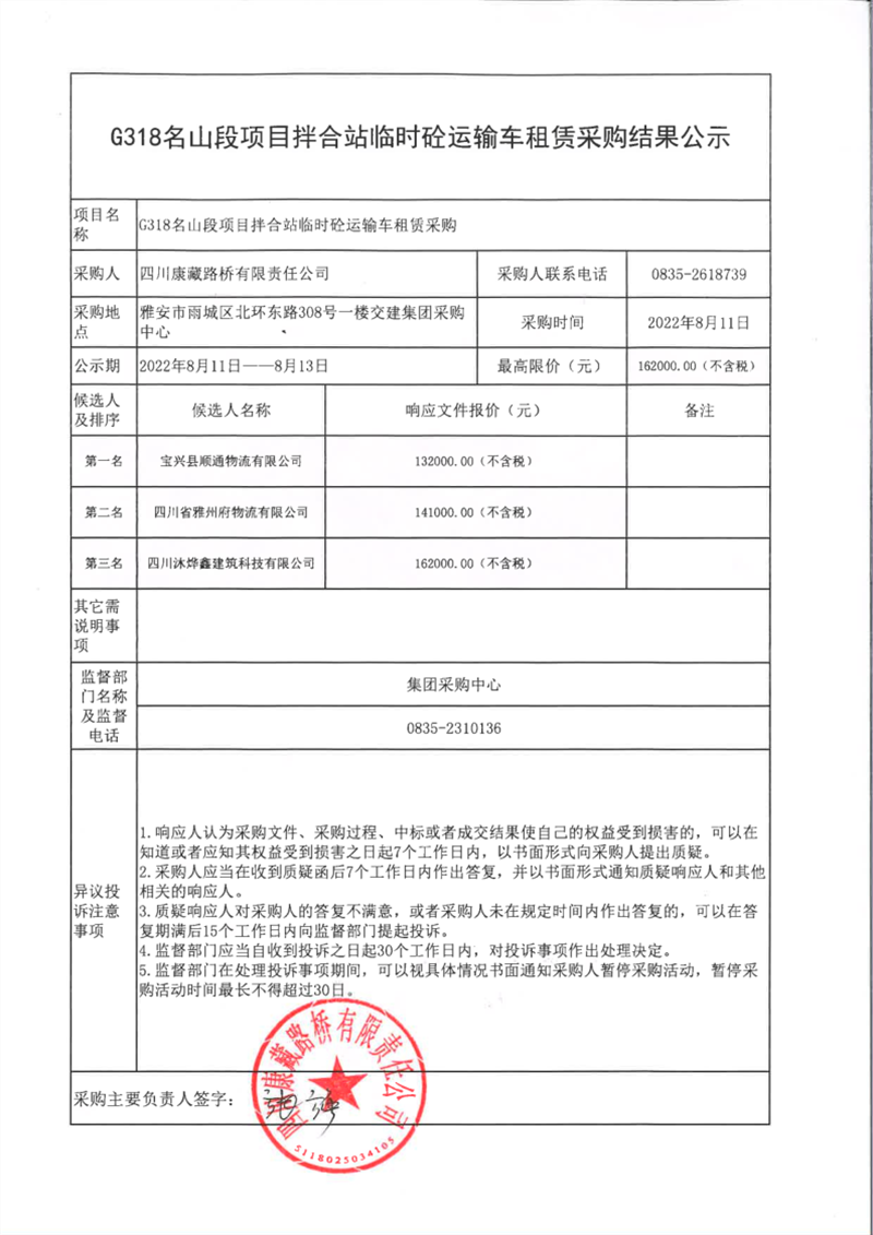 四川康藏路桥有限责任公司G318名山段项目拌合站临时砼运输车租赁采购结果公示