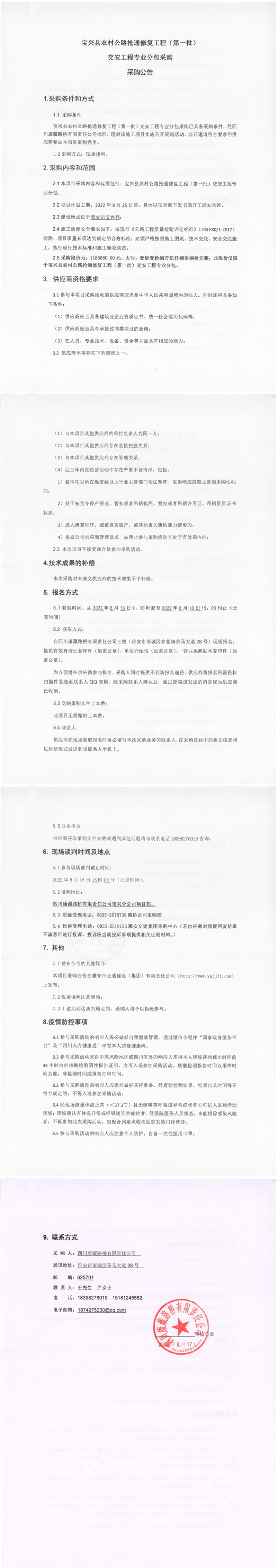 四川康藏路桥有限责任公司宝兴县农村公路抢通修复工程(第一批)交安工程专业分包采购采购公告