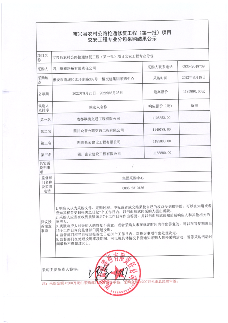 四川康藏路桥有限责任公司宝兴县农村公路抢通修复工程(第一批)交安工程专业分包采购结果公示