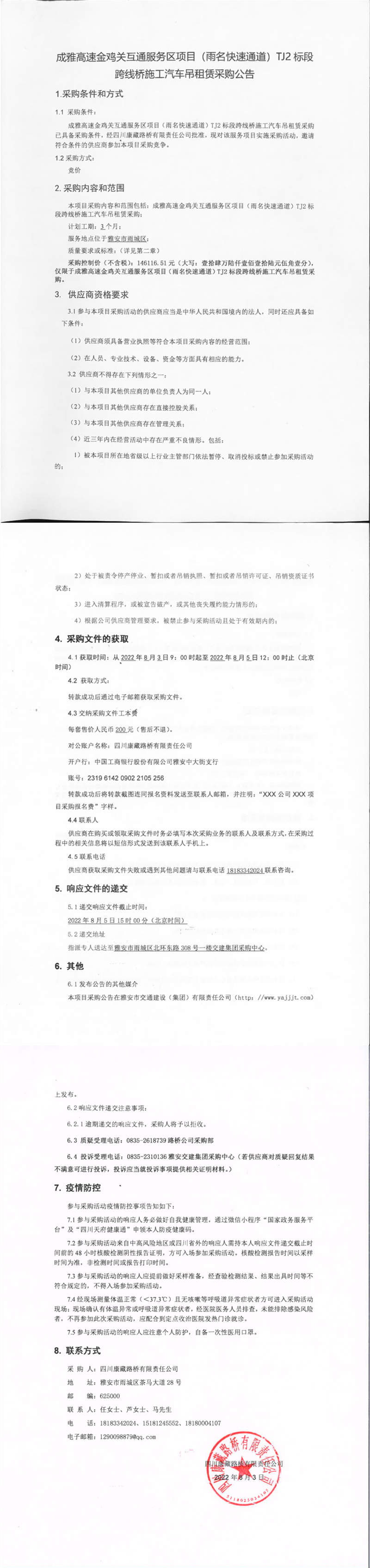 四川康藏路桥有限责任公司成雅高速金鸡关互通服务区项目(雨名快速通道)TJ2标段跨线桥施工汽车吊租赁采购公告