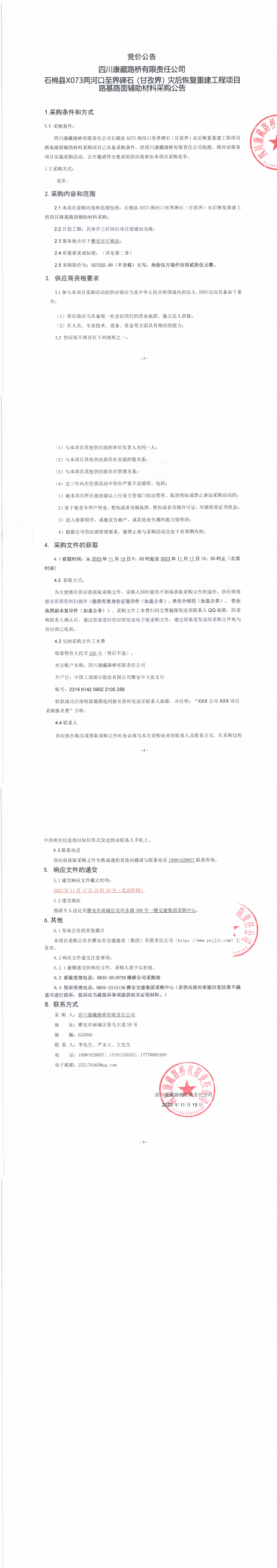 四川康藏路桥有限责任公司石棉县X073两河口至界碑石(甘孜界)灾后恢复重建工程项目路基路面辅助材料采购公告