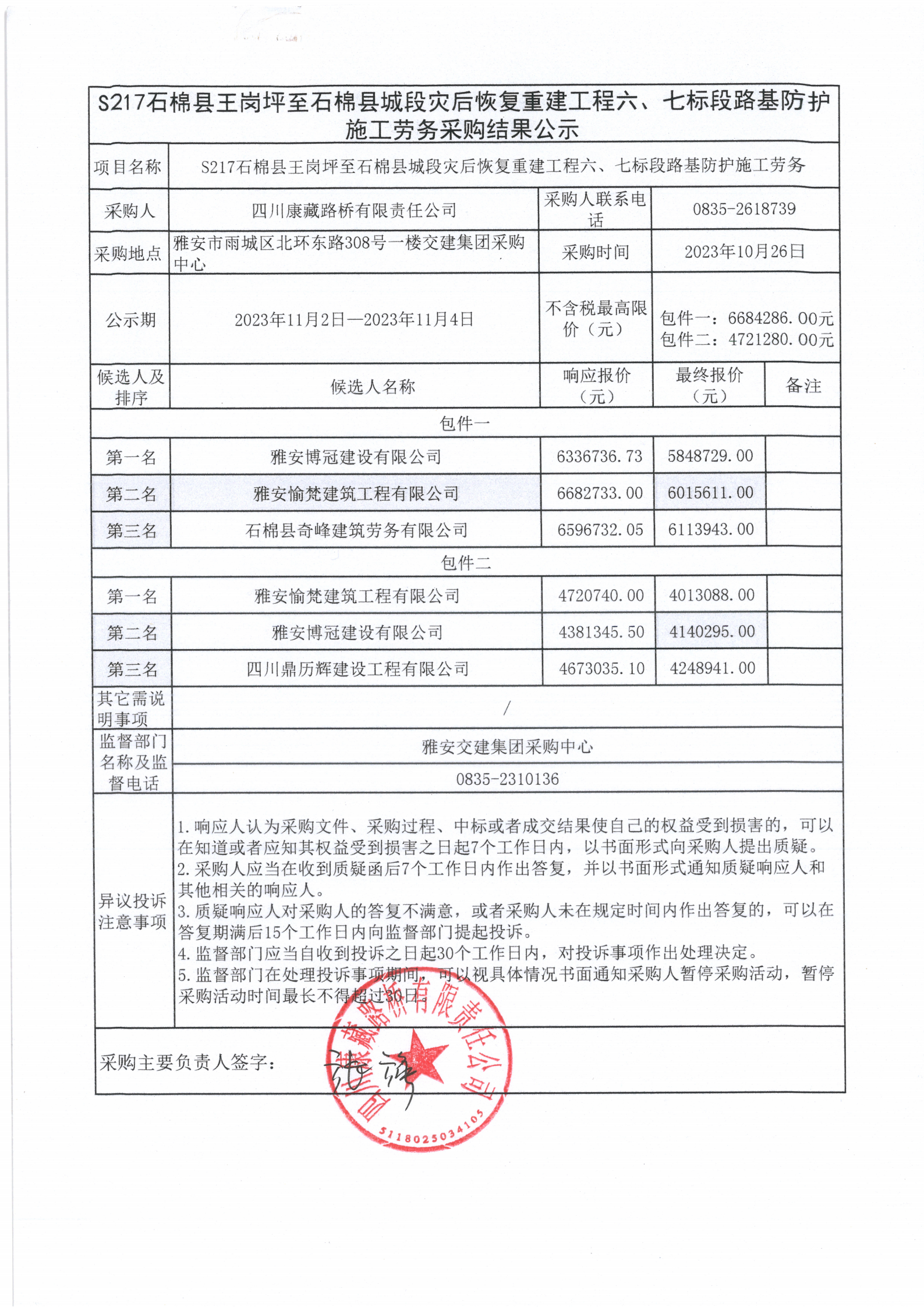 四川康藏路桥有限责任公司S217石棉县王岗坪至石棉县城段灾后恢复重建工程六、七标段路基防护施工劳务采购结果公示
