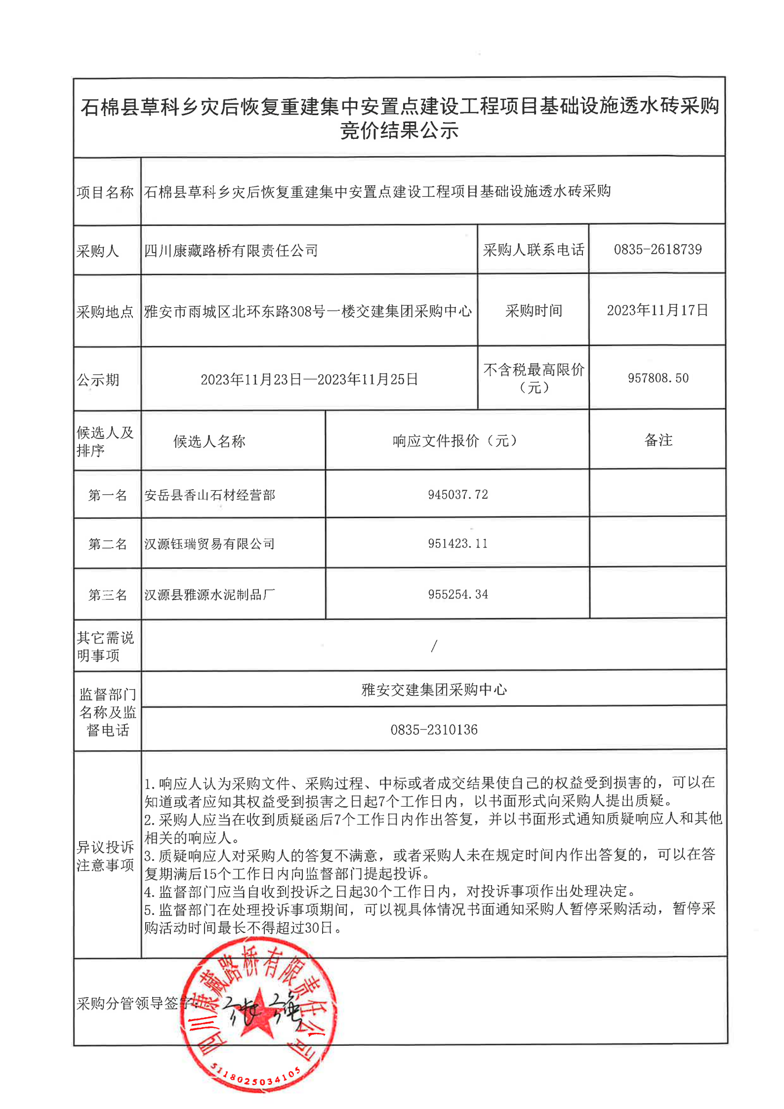 四川康藏路桥有限责任公司石棉县草科乡集中安置点重建工程项目透水砖采购结果公示