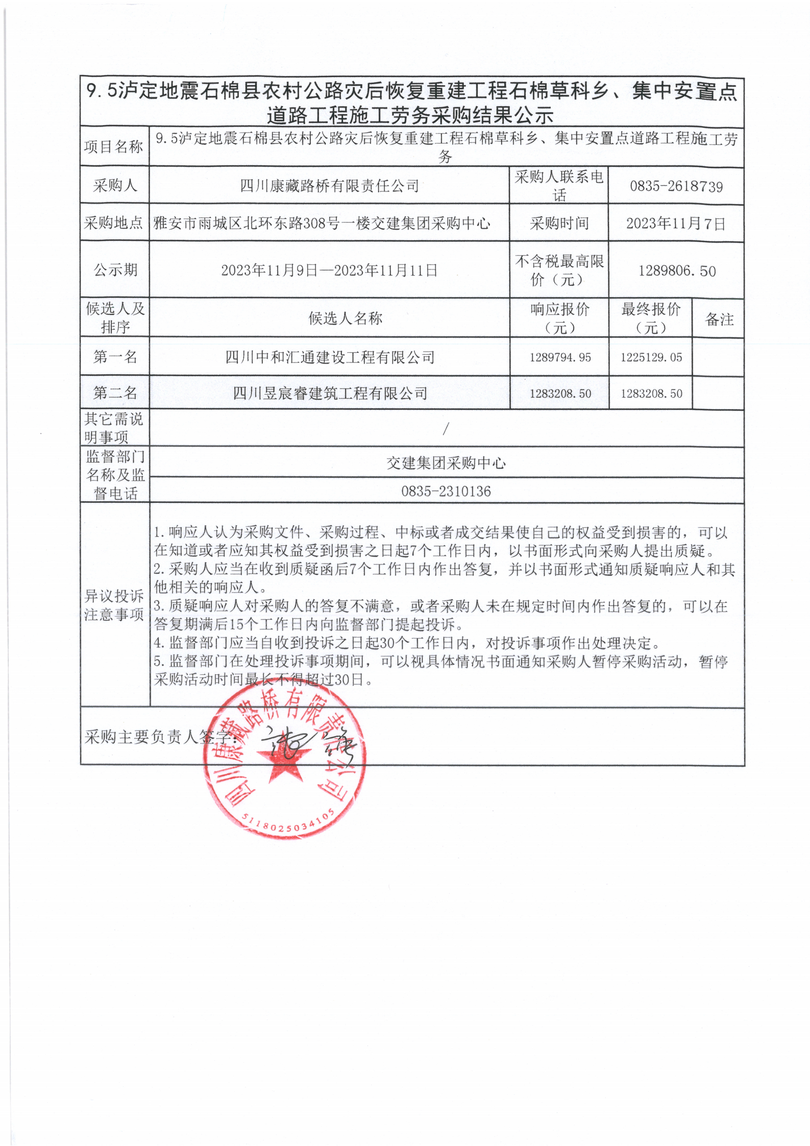 四川康藏路桥有限责任公司9.5泸定地震石棉县农村公路灾后恢复重建工程石棉草科乡、集中安置点道路工程施工劳务采购结果公示