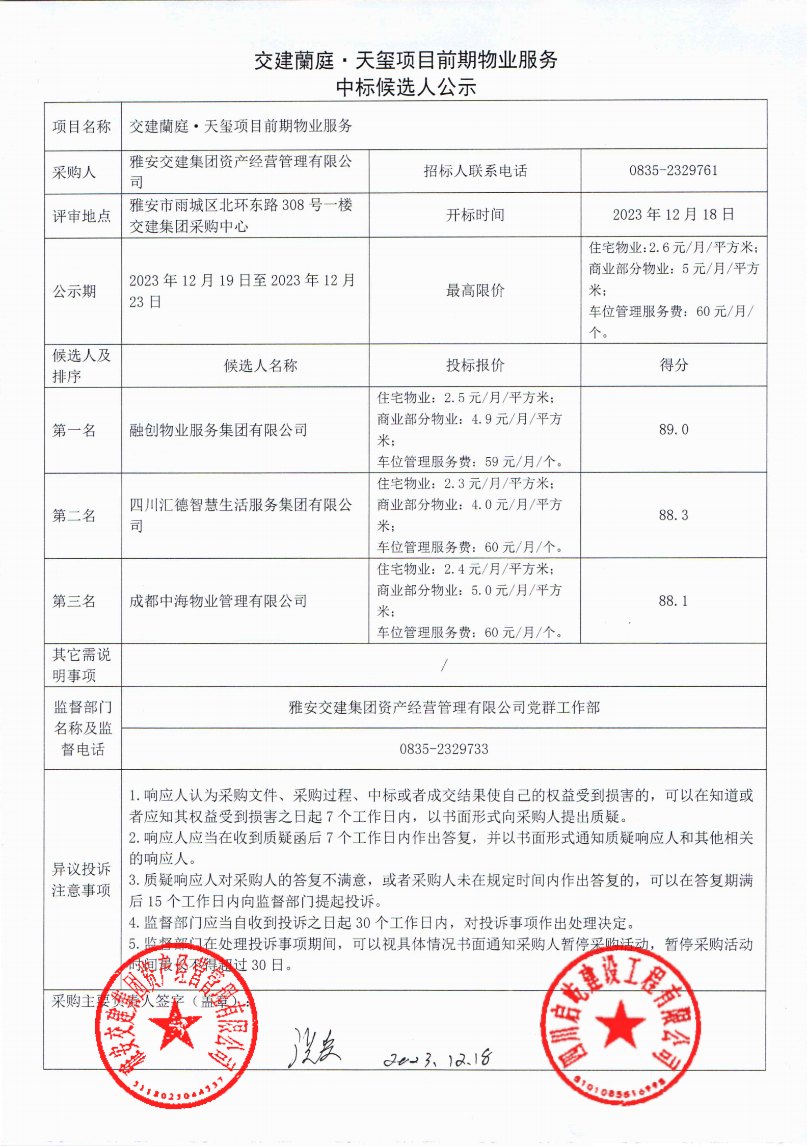 威廉希尔集团资产经营管理有限公司交建蘭庭·天玺项现在期物业服务中标候选人公示