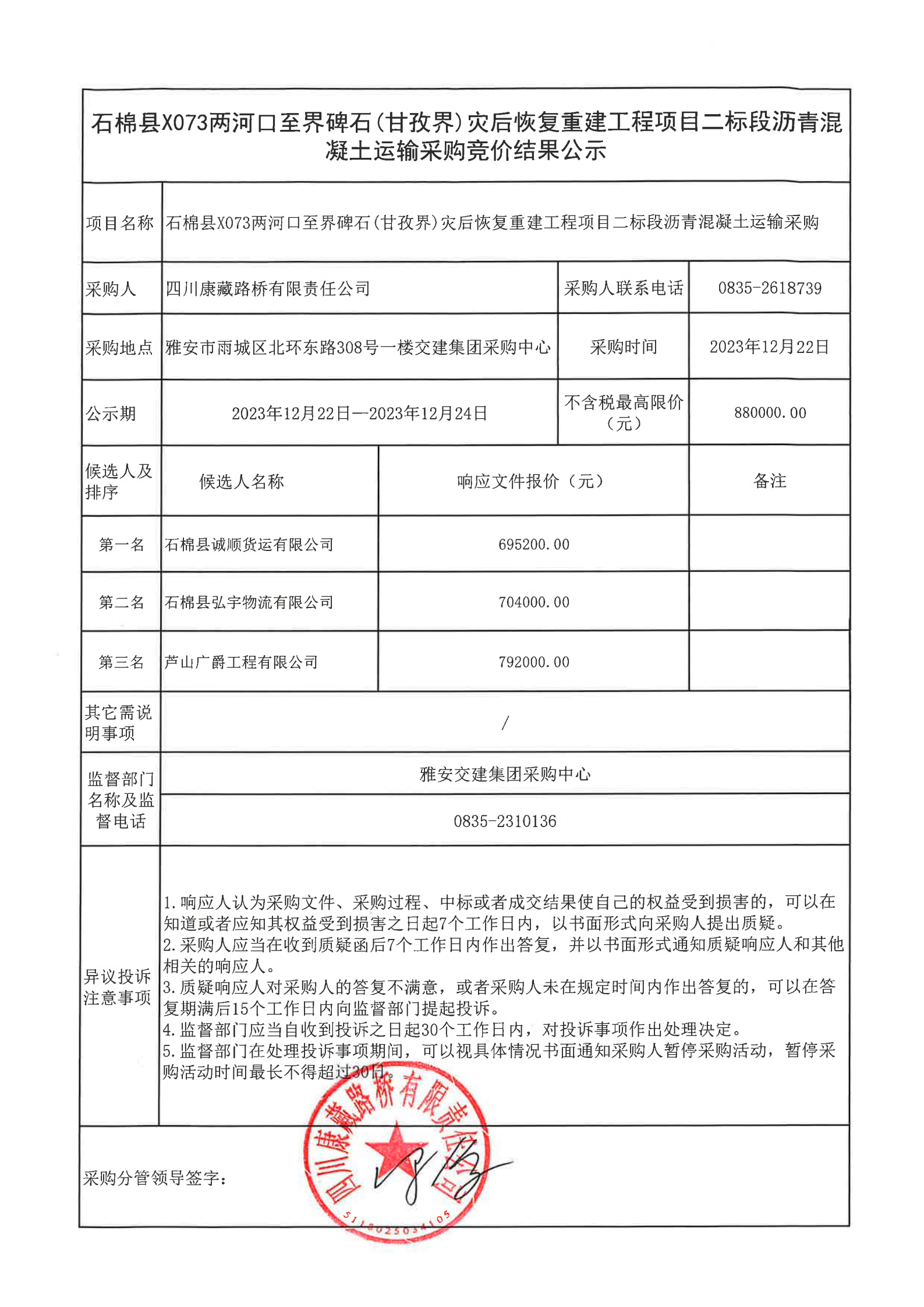 四川康藏路桥有限责任公司石棉县 X073 两河口至界碑石(甘孜界)灾后恢复重建工程项目二标段沥青混凝土运输采购竞价结果公示