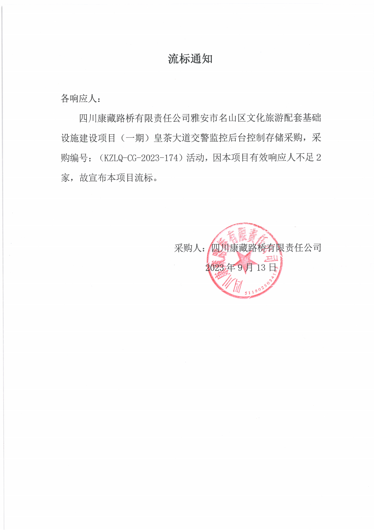 四川康藏路桥有限责任公司雅安市名山区文化旅游配套基础设施建设项目(一期)皇茶大道交警监控后台控制存储采购流标通知