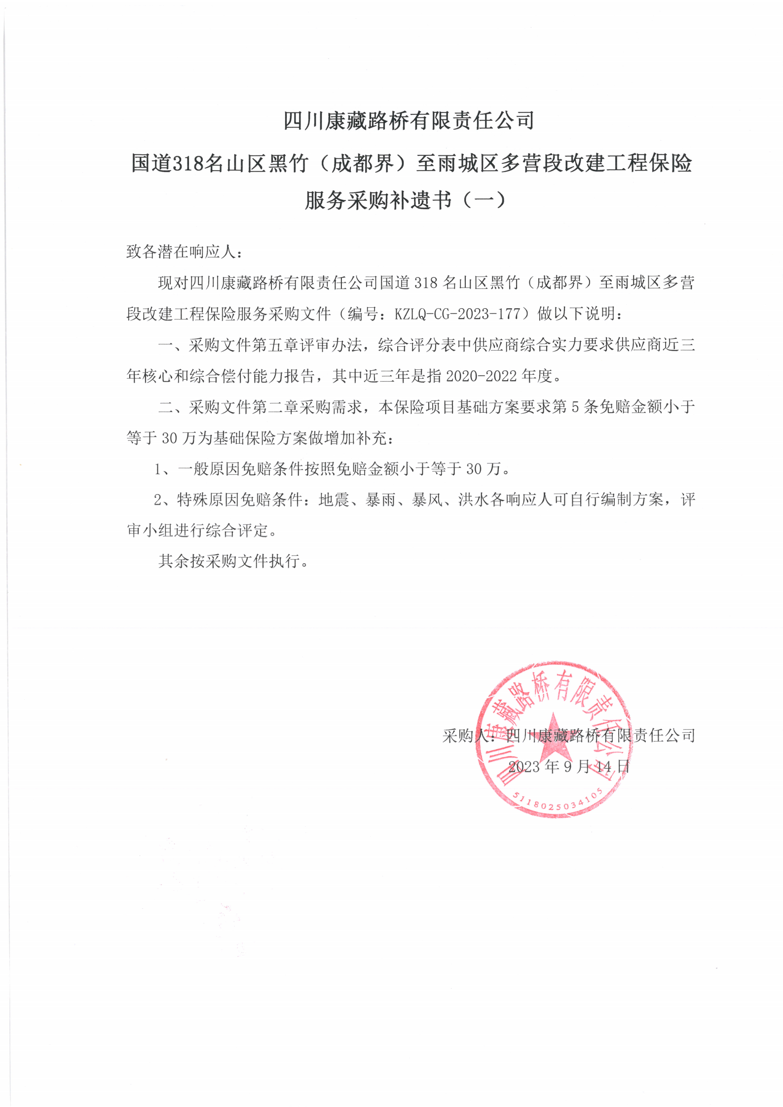 四川康藏路桥有限责任公司国道318名山区黑竹(成都界)至雨城区多营段改建工程保险服务采购补遗书(一)