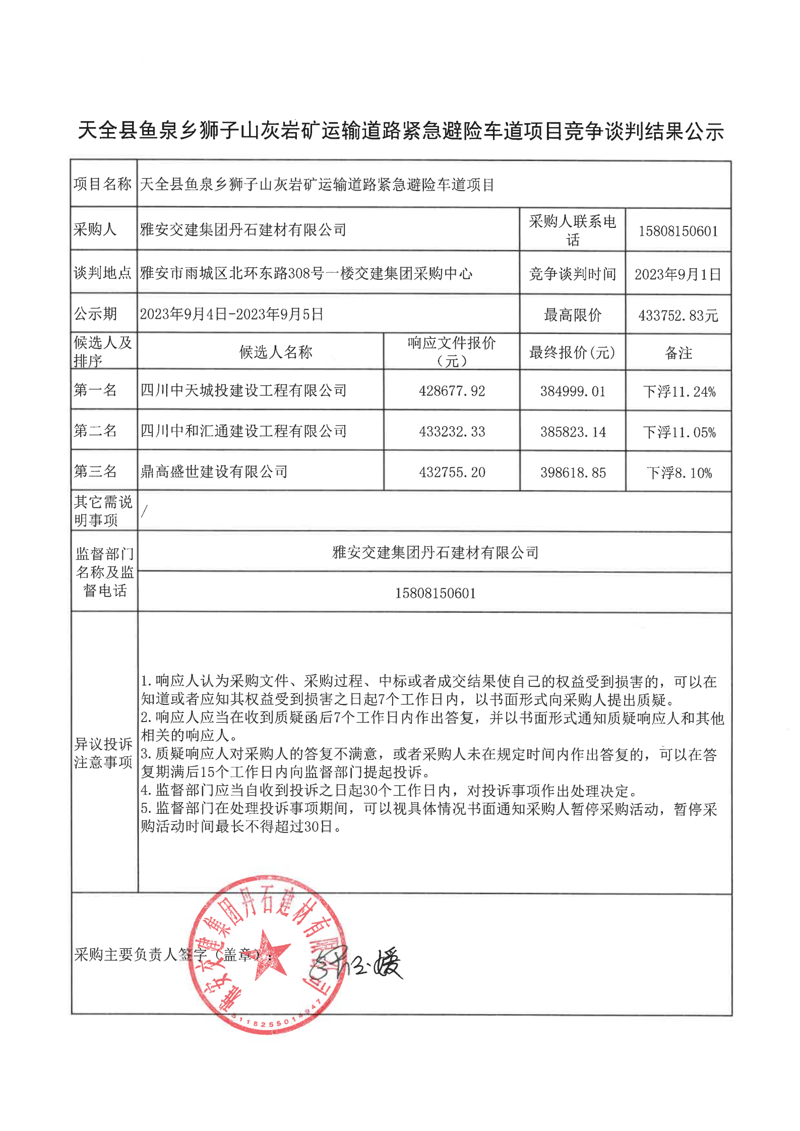 威廉希尔集团丹石建材有限公司天全县鱼泉乡狮子山灰岩矿运输道路紧急避险车道项目竞争谈判结果公示