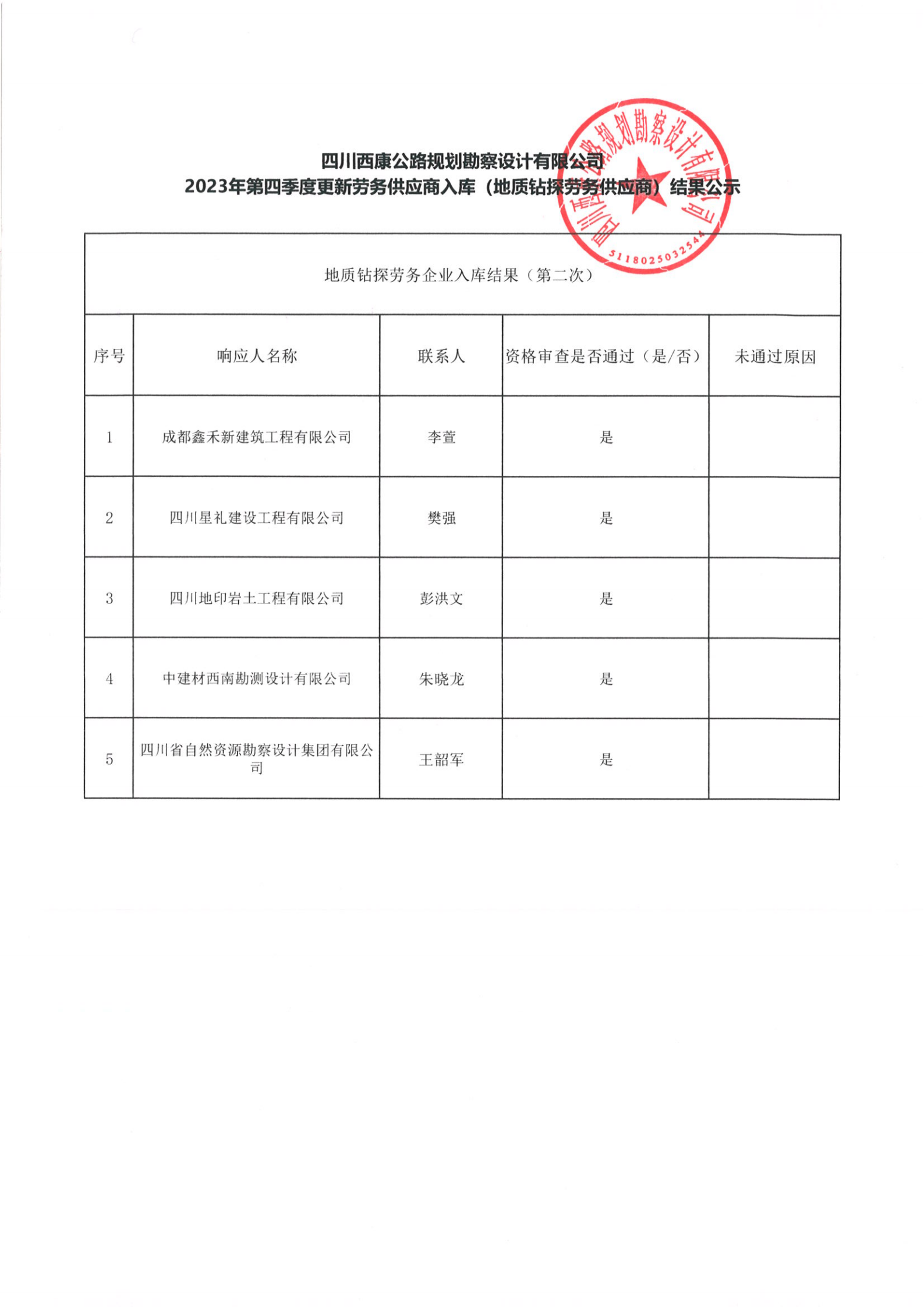 四川西康公路规划勘察设计有限公司2023年第四季度更新劳务供应入库 (地质钻探劳务供应商)结果公示