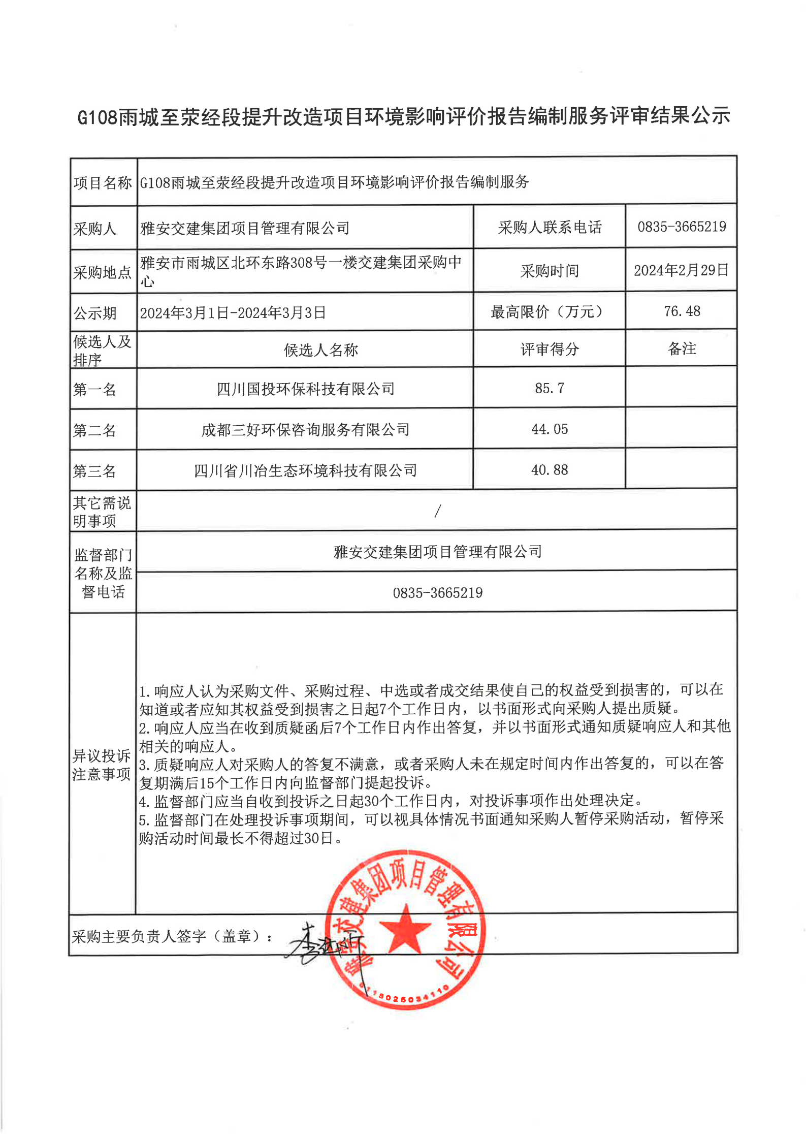 威廉希尔集团项目管理有限公司G108雨城至荥经段提升改造项目环境影响评价报告编制服务评审结果公示