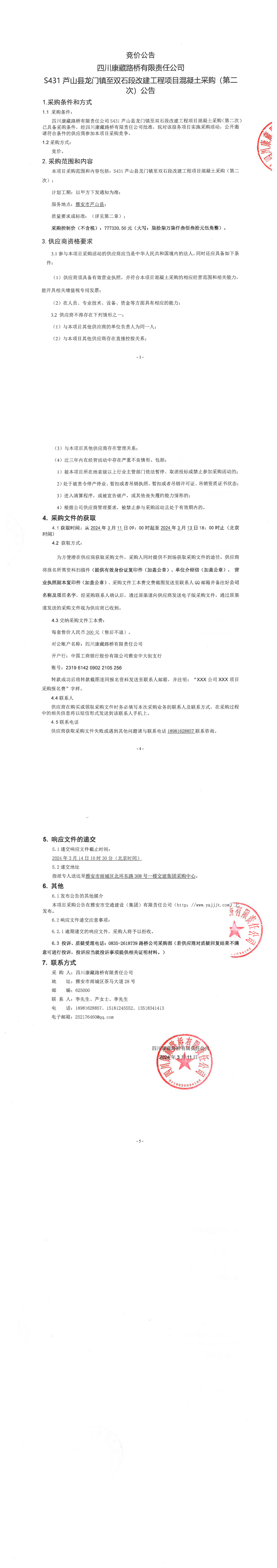 四川康藏路桥有限责任公司S431芦山县龙门镇至双石段改建工程项目混凝土采购(第二次)公告