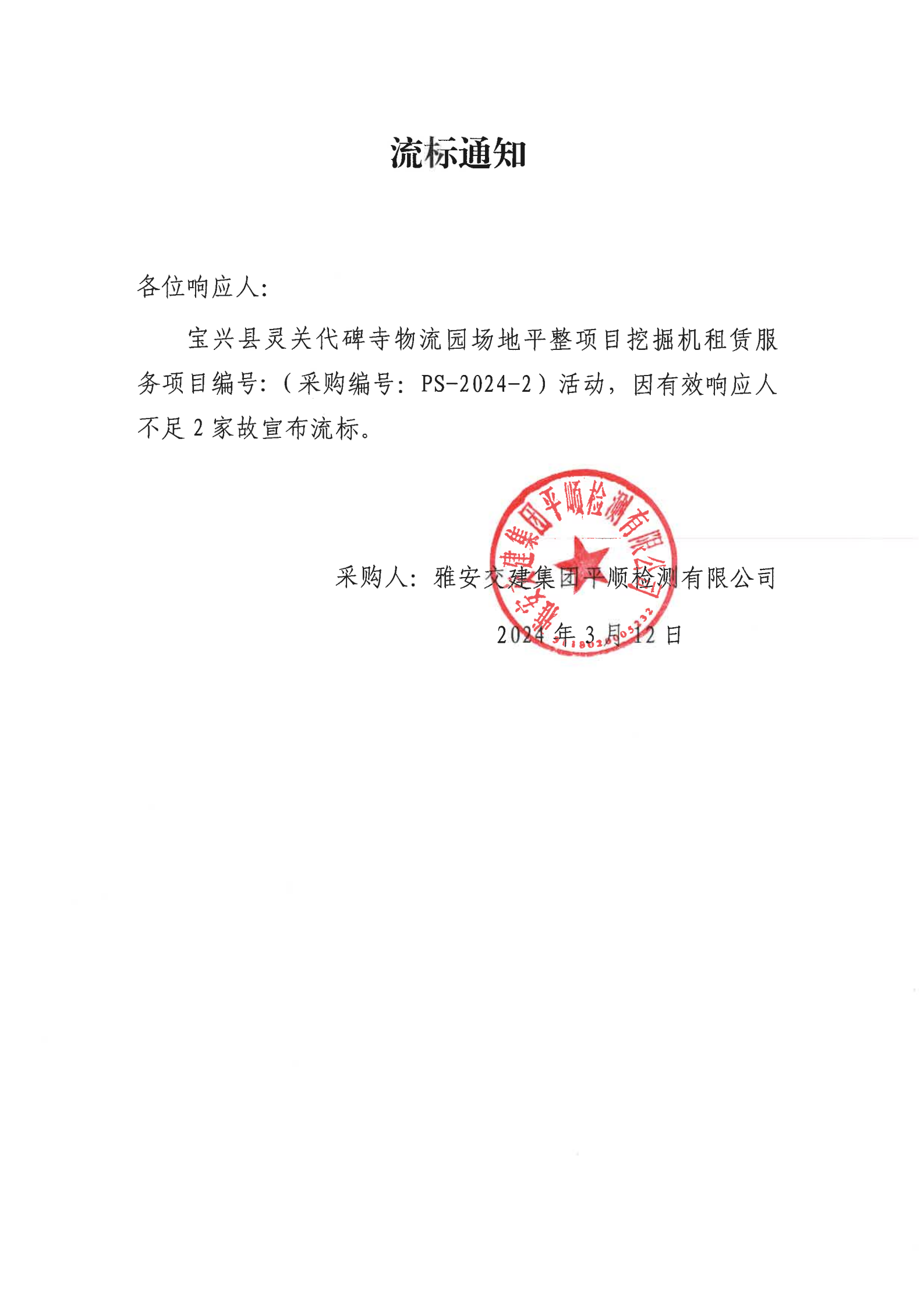 威廉希尔集团平顺检测有限公司宝兴县灵关代碑寺物流园场地平整项目挖掘机租赁服务流标通知