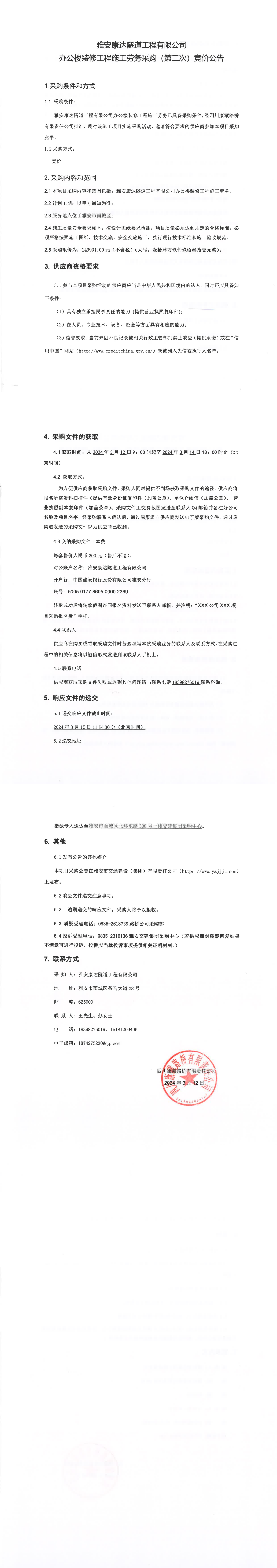 雅安康达隧道工程有限公司办公楼装修工程施工劳务竞价采购(第二次)公告