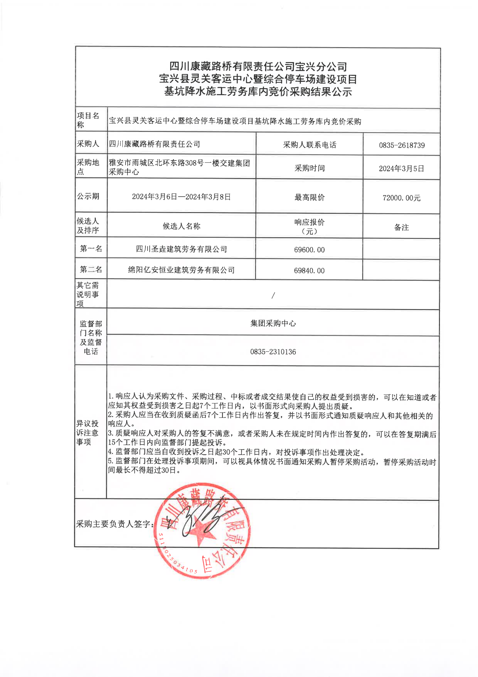 四川康藏路桥有限责任公司宝兴分公司宝兴县灵关客运站中心暨综合停车场建设项目基坑降水施工劳务库内竞价采购结果公示
