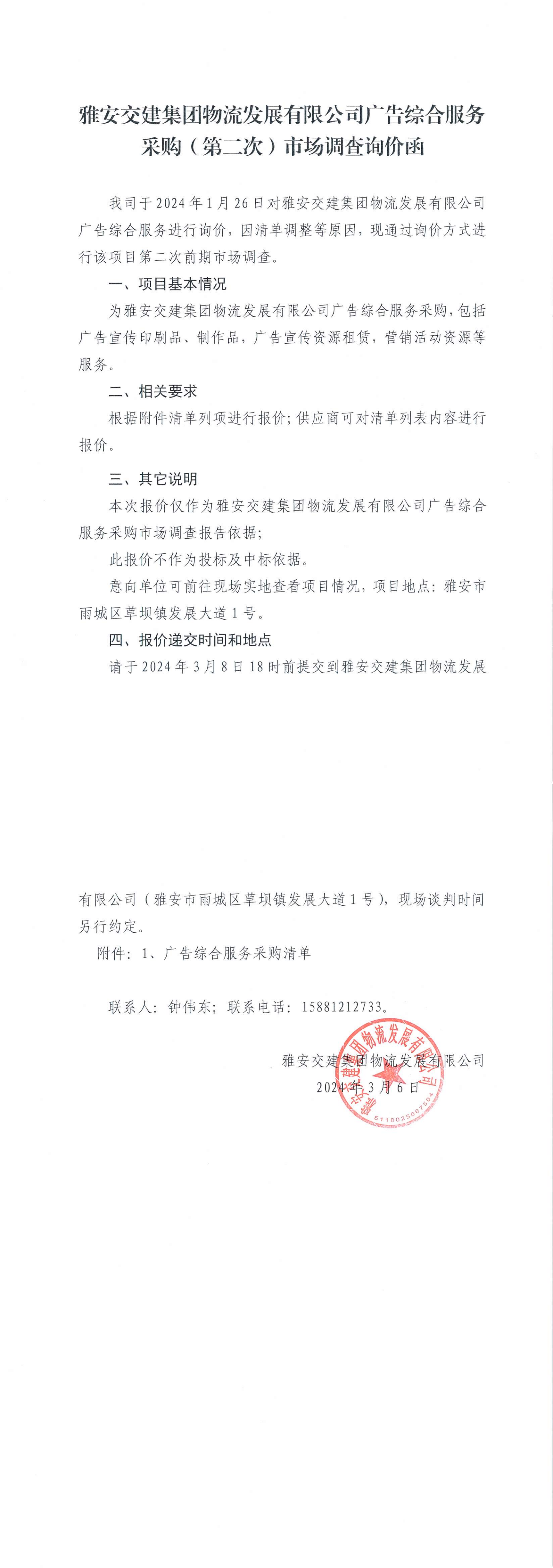 威廉希尔集团物流开展有限公司广告综合服务采购(第二次)市场调查询价函